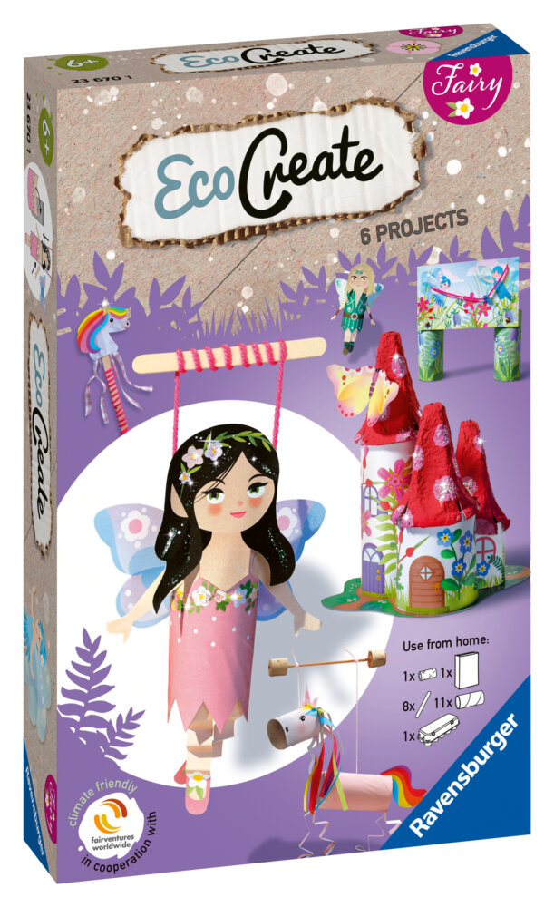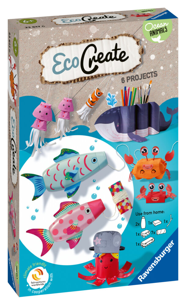 Mit den EcoCreate-Bastelsets von Ravensburger können Kinder ab 6 Jahren tolle Upcycling-Projekte basteln. Von zu Hause werden dafür leere Milchtüten, Eierkartons, oder Eisstiele aus Holz benötigt. Der Clou: Alles andere zum Basteln steckt in der Box. Für drei dieser DIY-Sets durfte ich die Konzeption und Ideenentwicklung der Bastelprojekte übernehmen. Das Ergebnis: Kunterbunte Fische aus Shampoo-Flaschen, ein tanzendes Regenbogen-Einhorn aus Toilettenpapierrollen und viele weitere Ideen, die Kreativität mit Nachhaltigkeit verbinden.